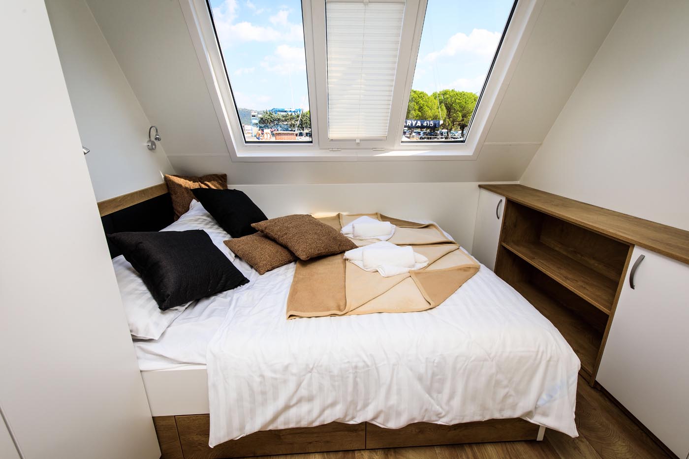 Das Schlafzimmer ist mit einem Doppelbett (160 x 200 cm) und niedrigen Schränken ausgestattet.