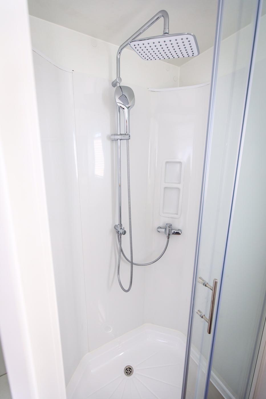 Das Badezimmer Es verfügt über eine große Dusche (80 x 100 cm), Badezimmerschränke mit Spiegel, Wasserkocher, Trichter mit Edelstahlarmaturen und Toilettenschüssel.