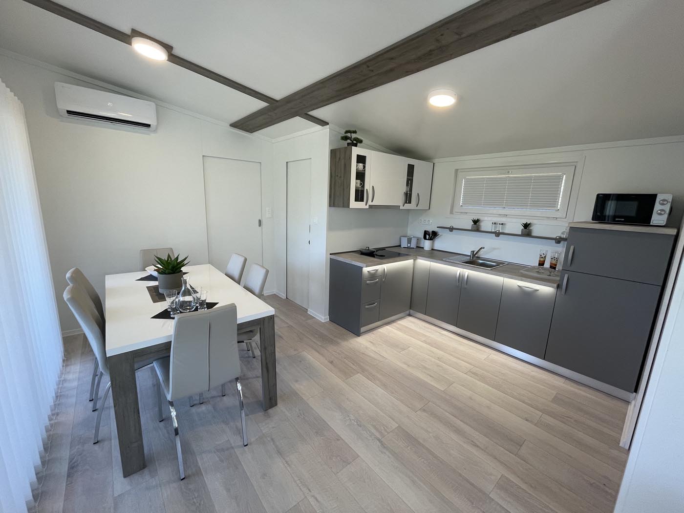 Kuhinja u L obliku opremljena je hladnjakom, zamrzivačem, staklokeramičkom pločom, izvlačnom napom, sudoperom od nehrđajućeg čelika, armaturom i ormarićima ispod i iznad kuhinjskog pulta.