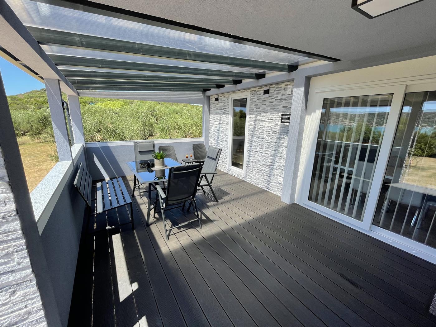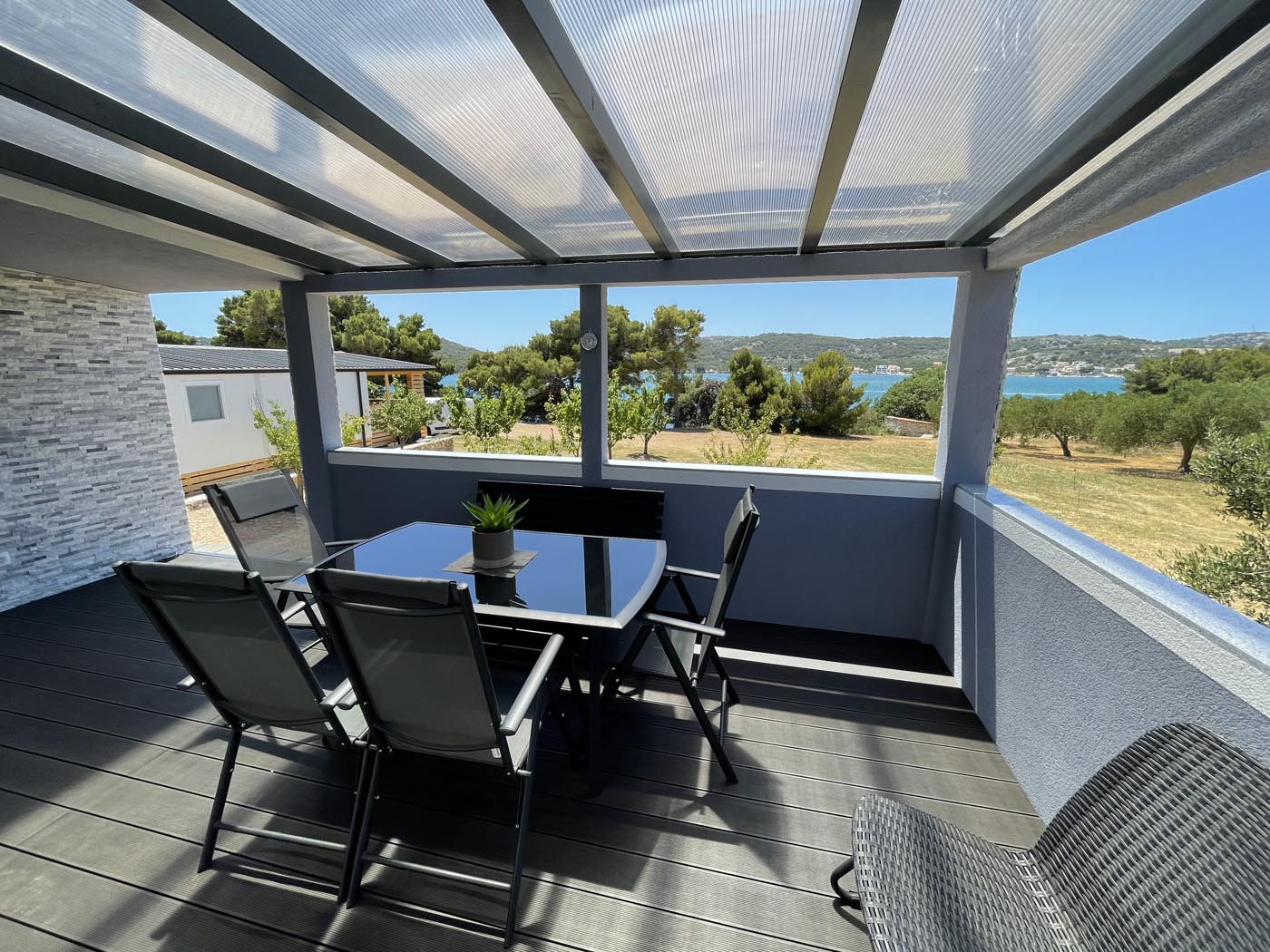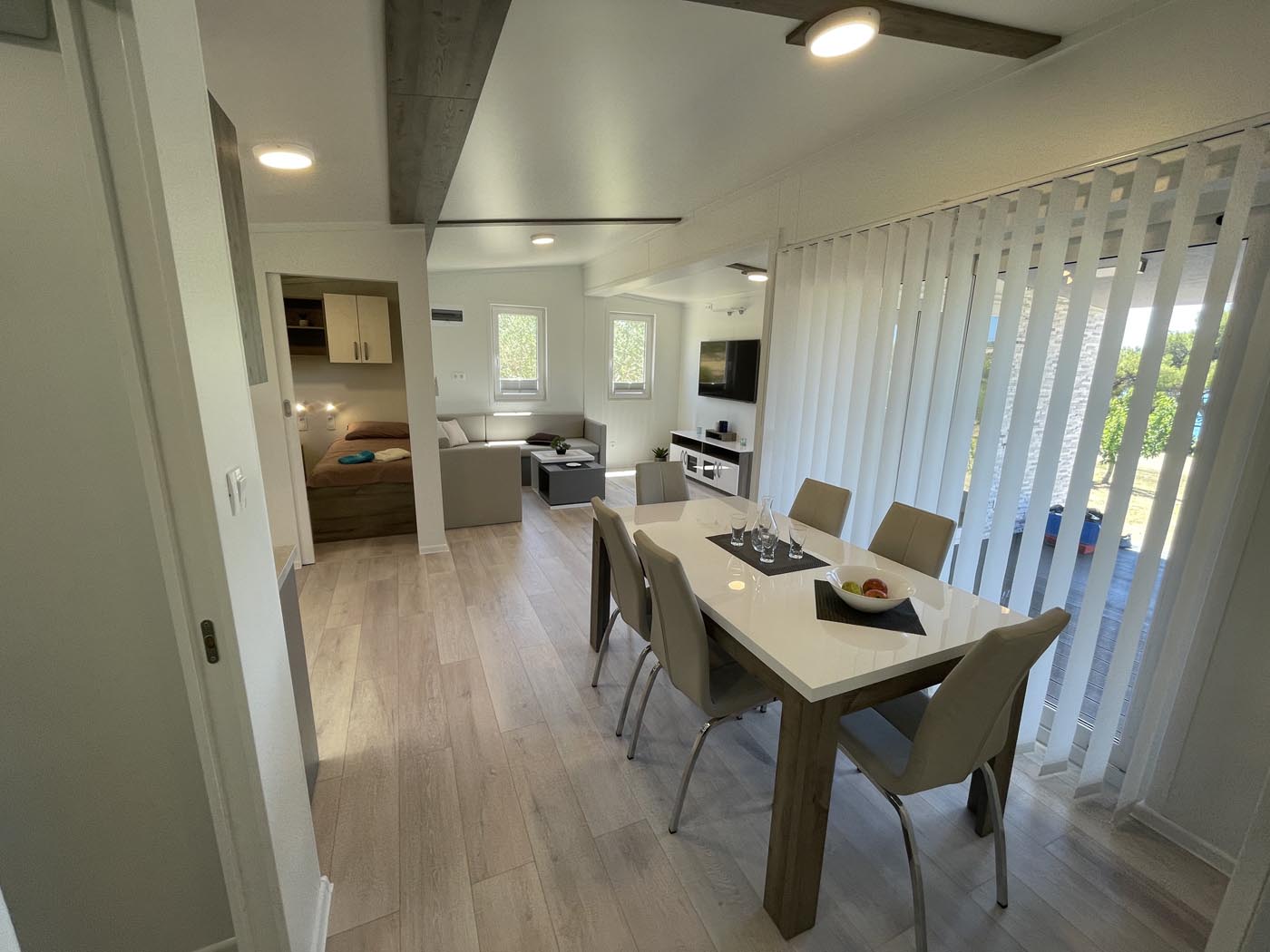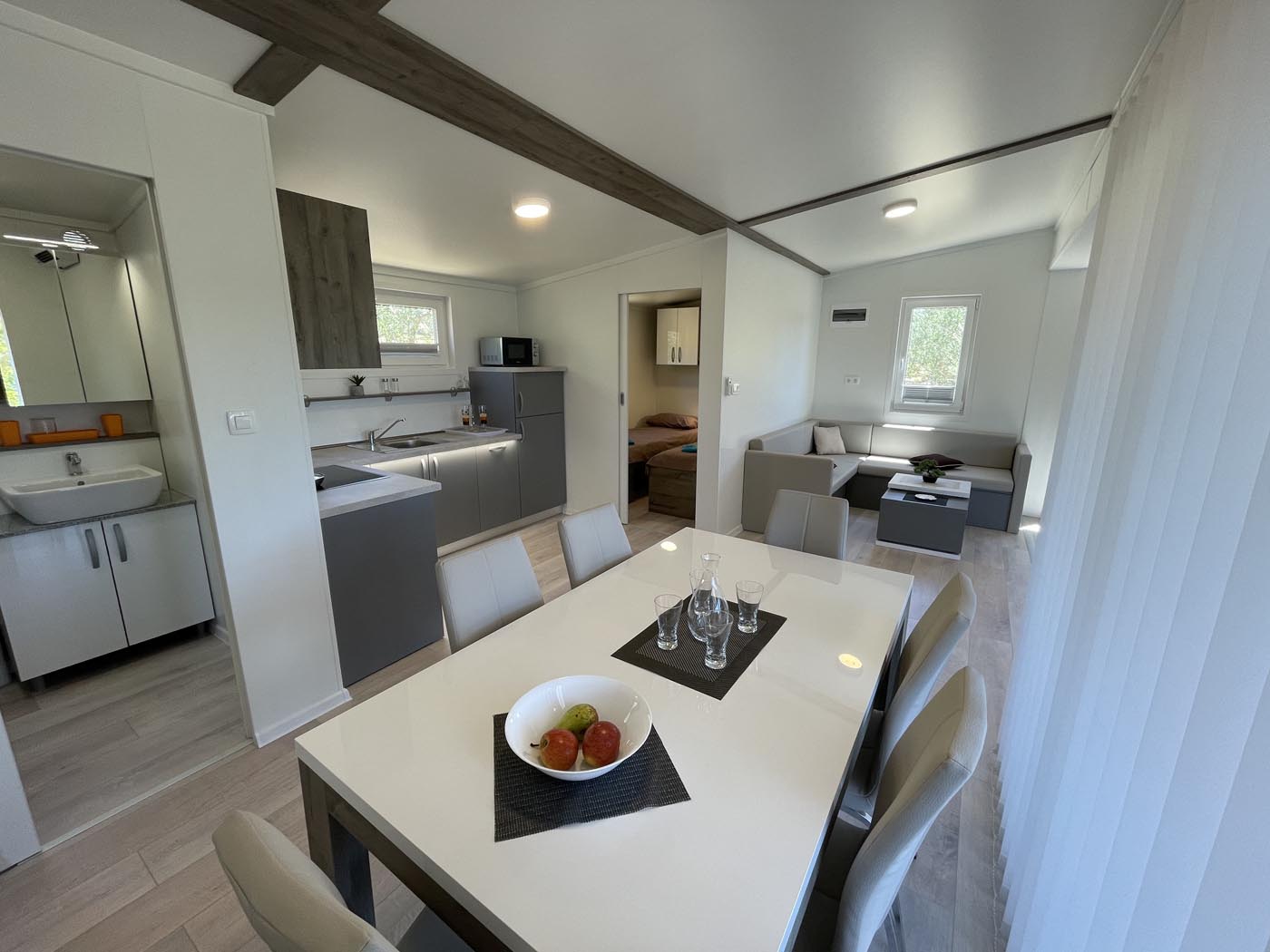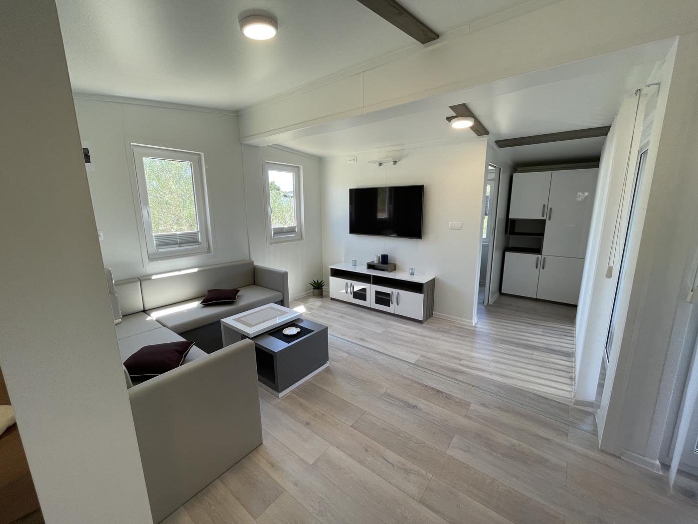 Dnevna soba opremljena je sjedećom garniturom, koju možete rastegnuti u ležaj za 2 osobe (140 x 200 cm), stolićem i velikim garderobnim ormarom.