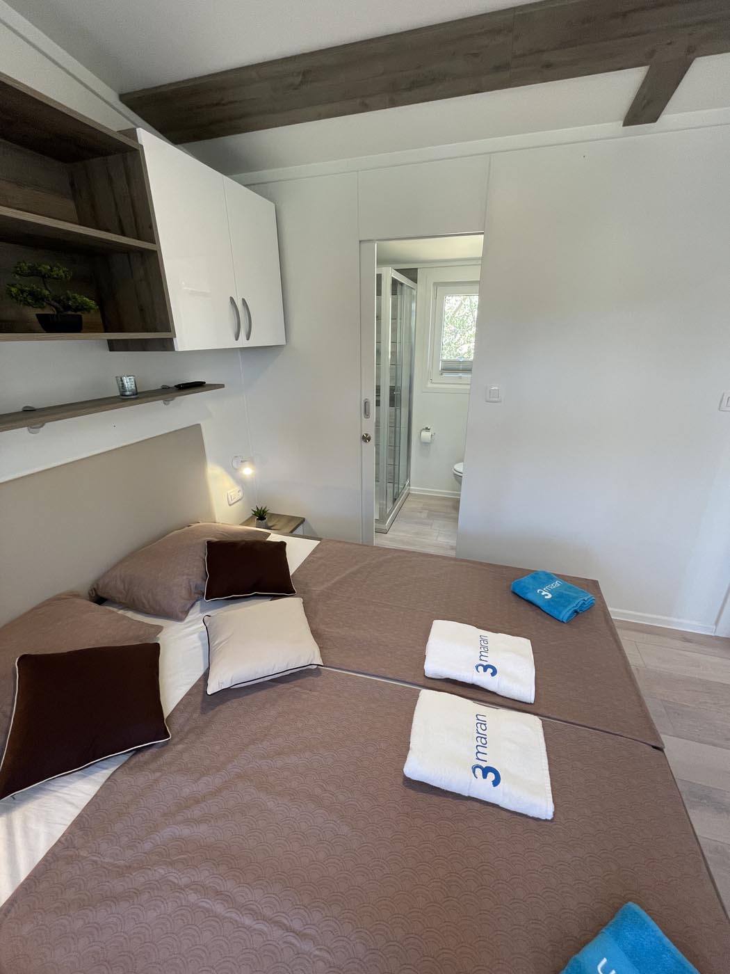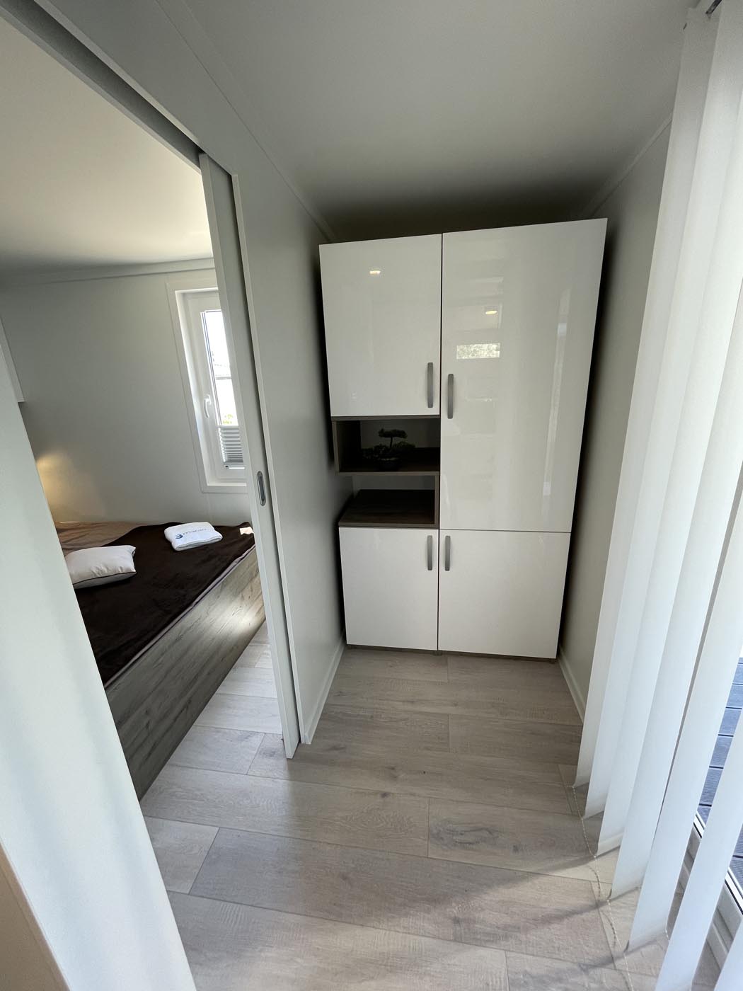 Spavaonica 2 ima dva kreveta s madracima (80 x 200 cm), jedan veliki garderobni ormar i ormare sa zidnim mostom.