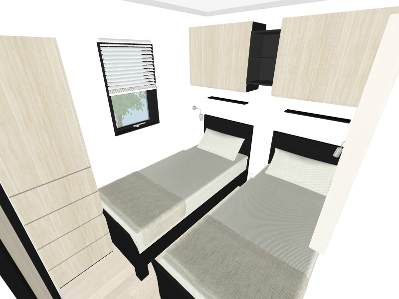 Spavaonica 2 ima dva kreveta s madracima (80 x 200 cm), jedan veliki garderobni ormar i ormare sa zidnim mostom.
