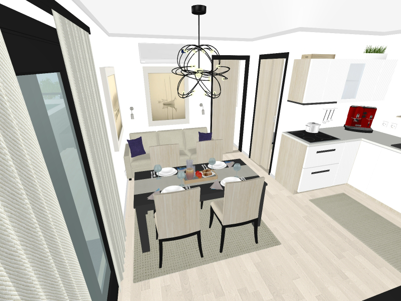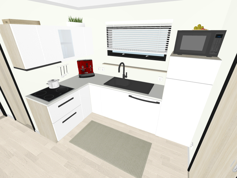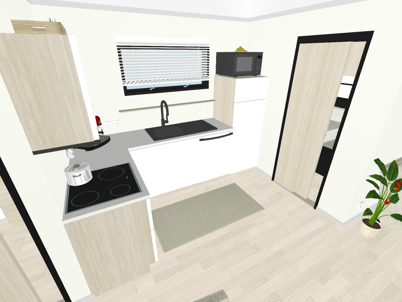 Kuhinja u L obliku opremljena je hladnjakom, zamrzivačem, staklokeramičkom pločom, izvlačnom napom, sudoperom od nehrđajućeg čelika, armaturom i ormarićima ispod i iznad kuhinjskog pulta.