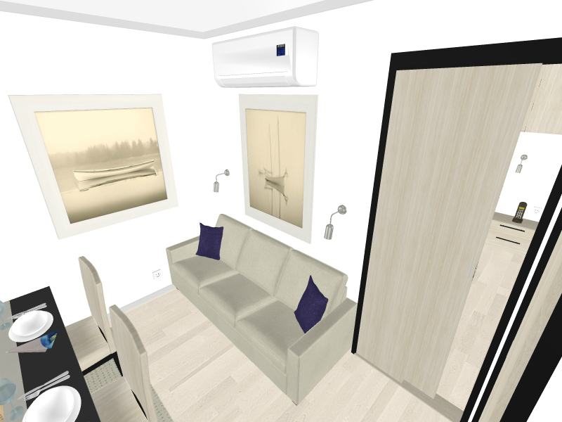 Dnevna soba opremljena je sjedećom garniturom, koju možete rastegnuti u ležaj za 2 osobe (140 x 200 cm), stolićem i velikim garderobnim ormarom.