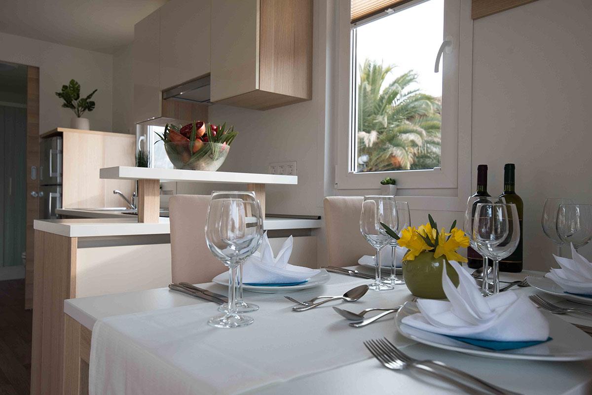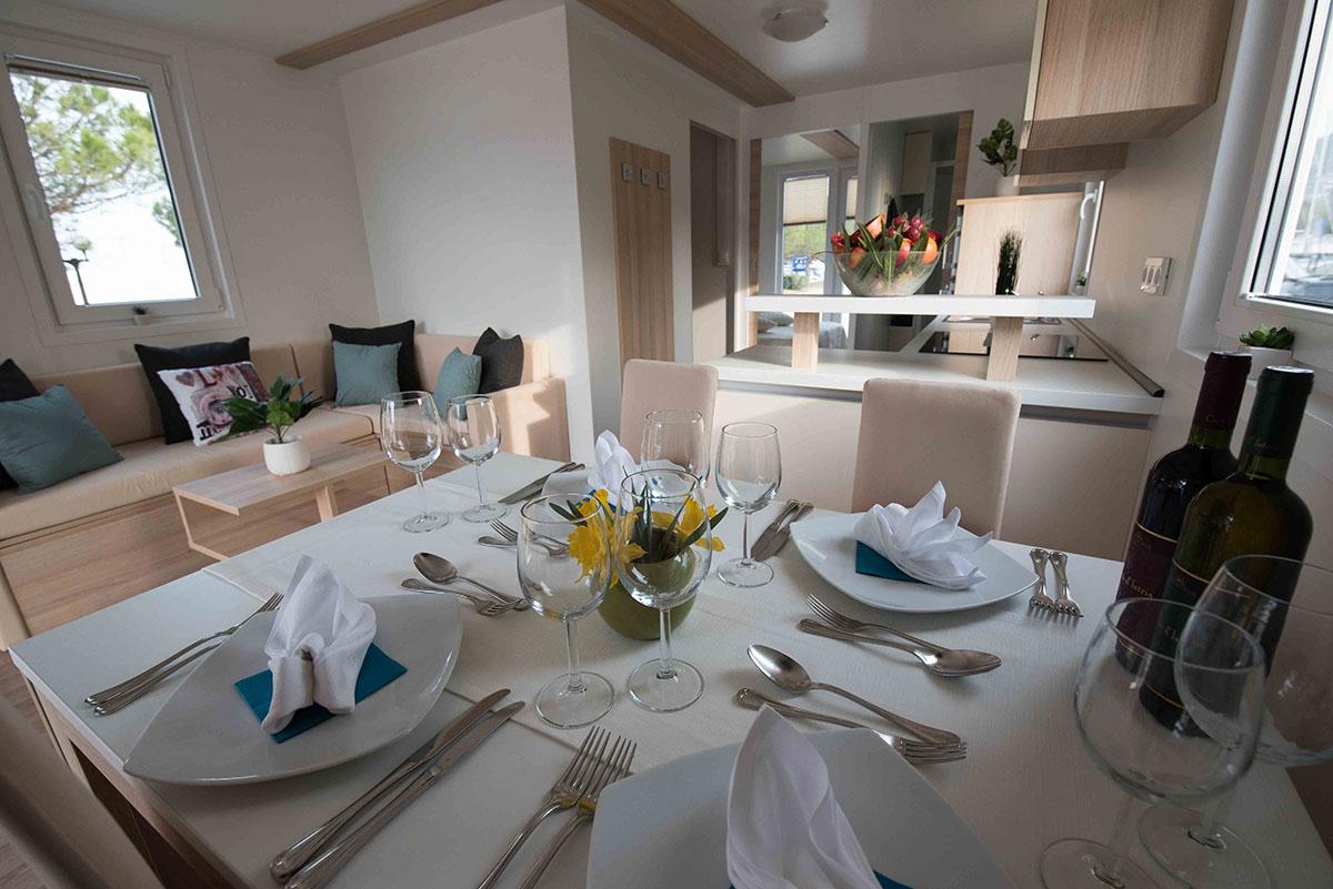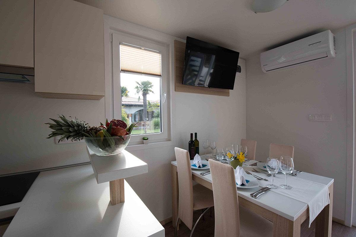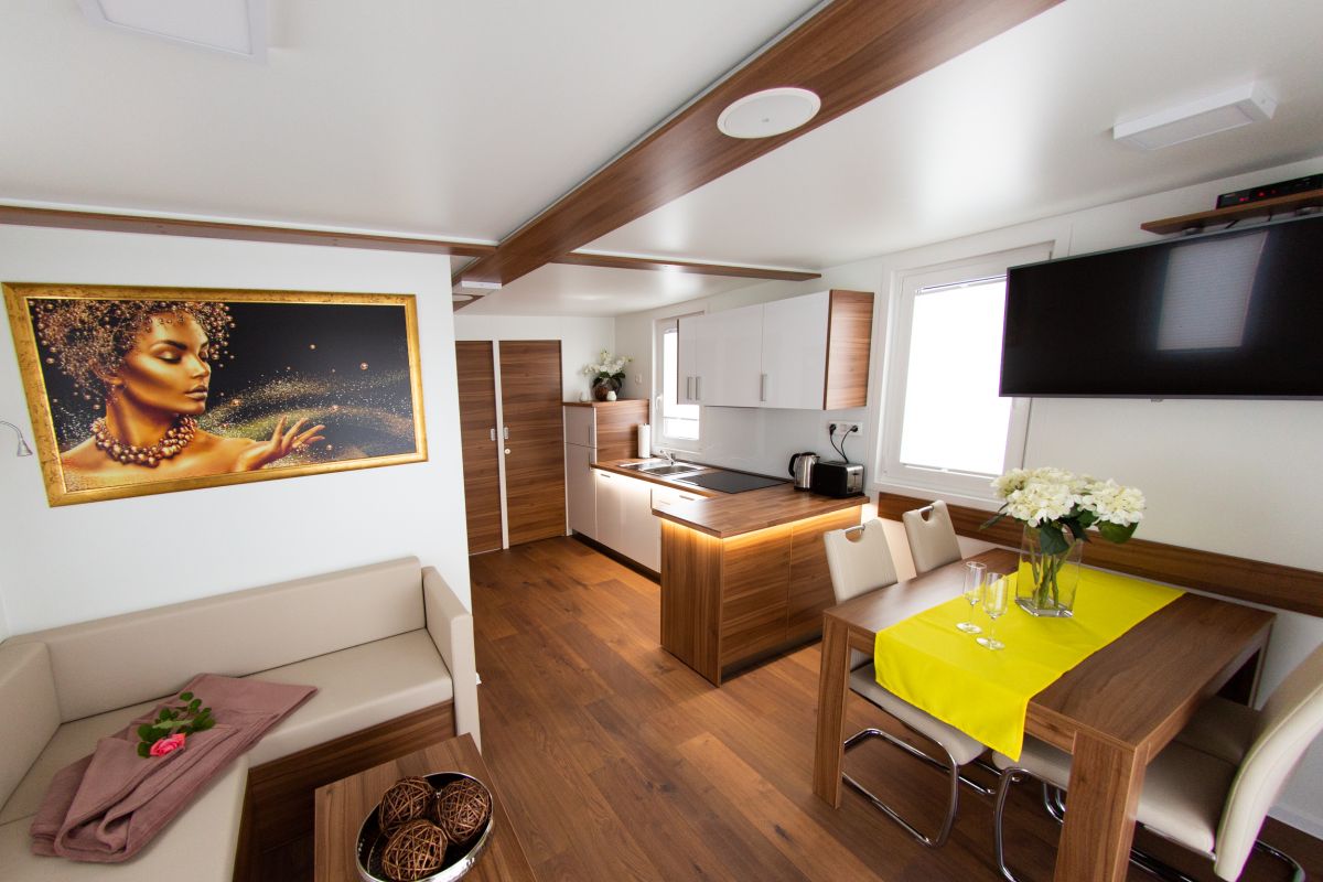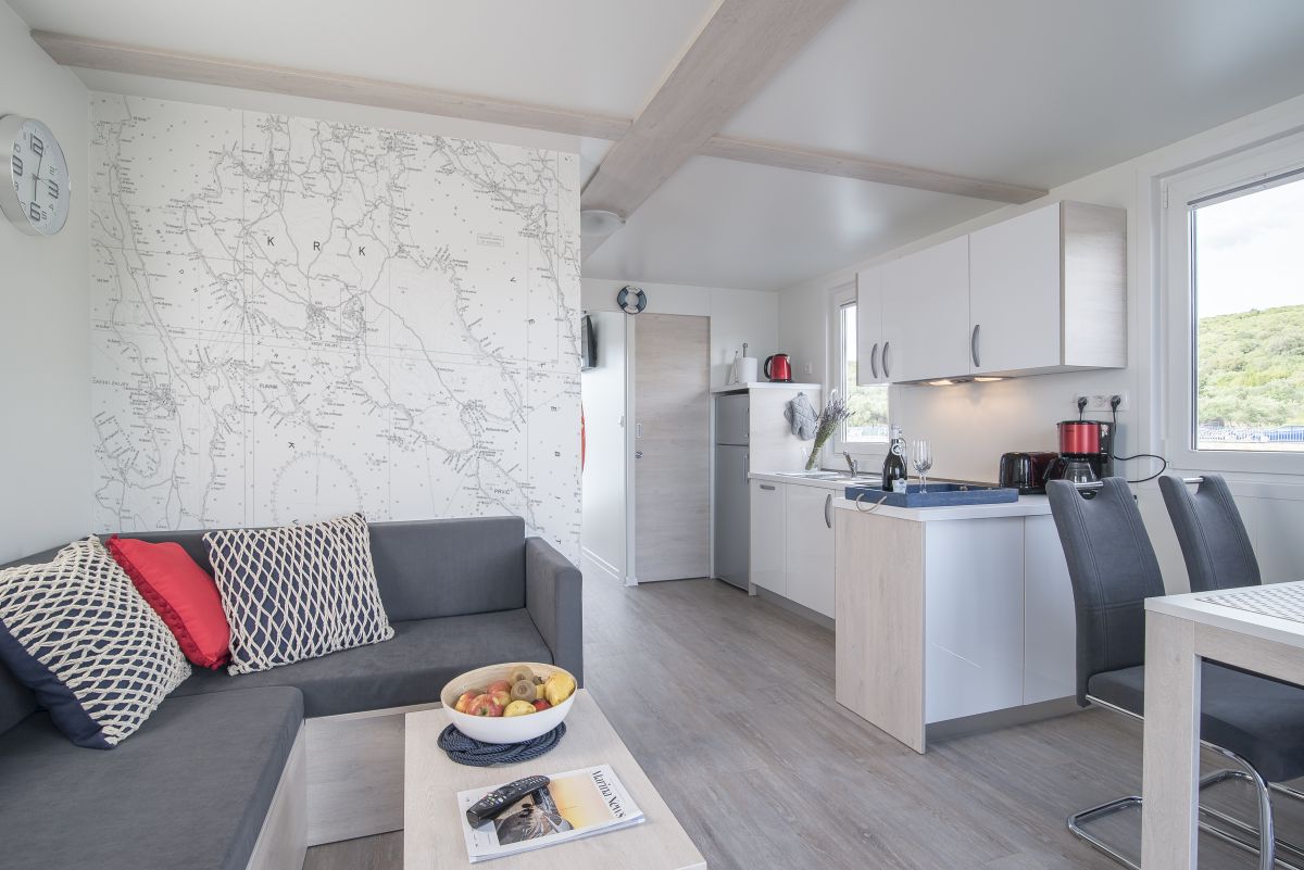 Dnevna soba je opremljena s sedežno garnituro, ki jo lahko raztegnete v ležišče za 2 osebi (140 x 200 cm), mizico in veliko garderobno omaro.