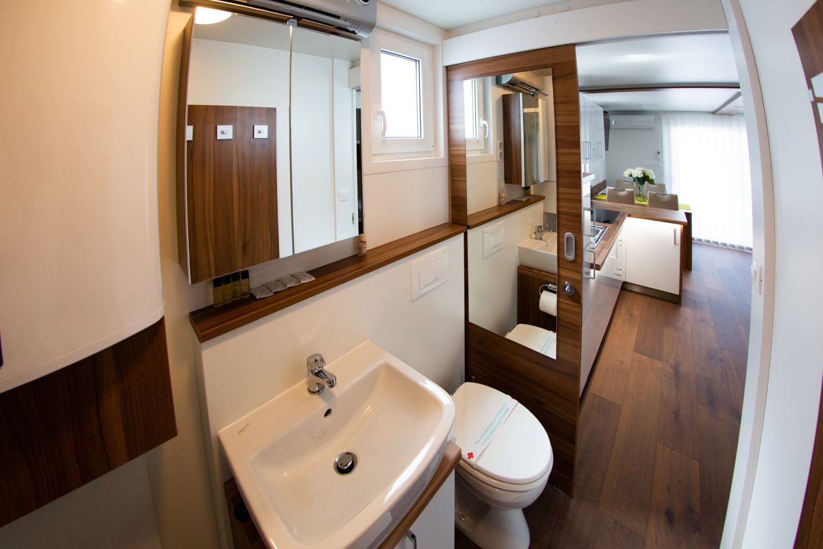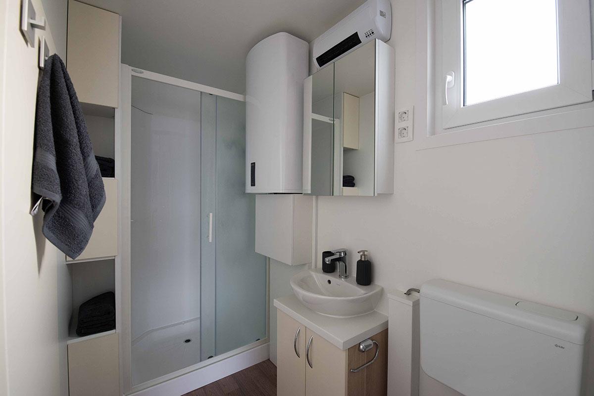 Kopalnica ima veliko tuš kabino (80 x 100 cm), kopalniške omarice z ogledalom, grelec vode, lijak z inox armaturo in toaletno školjko.