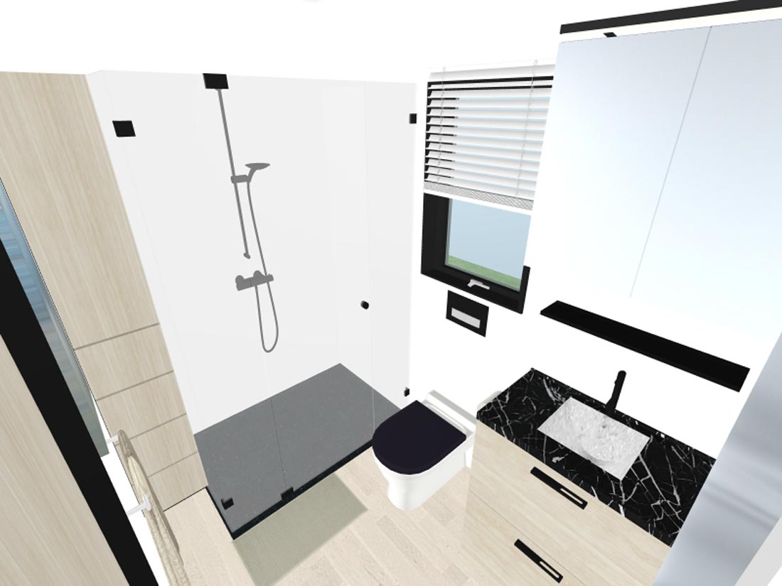 Kopalnica 1 ima tuš kabino (80 x 80 cm), kopalniške omarice z ogledalom, grelec vode, lijak z inox armaturo in toaletno školjko.