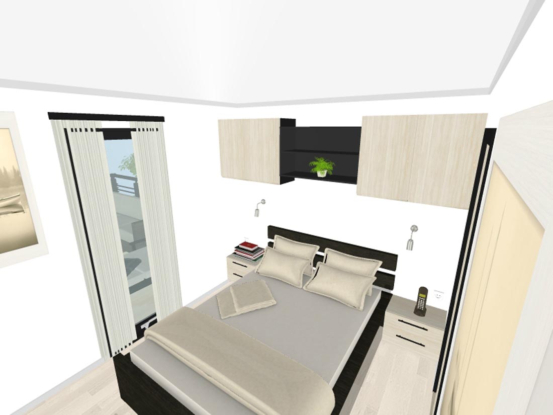 Spalnica 1 je opremljena z zakonsko posteljo (160 x 200 cm) in omarami s stenskim mostom.