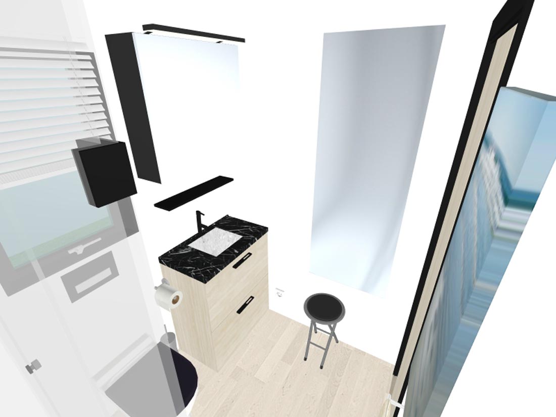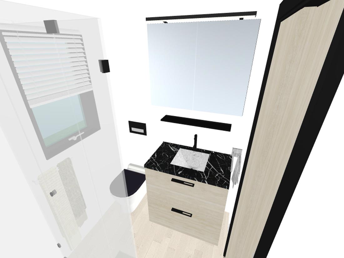 Kopalnica 1 ima tuš kabino (80 x 80 cm), kopalniške omarice z ogledalom, grelec vode, lijak z inox armaturo in toaletno školjko.