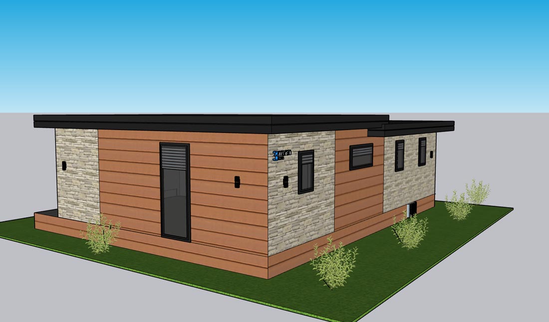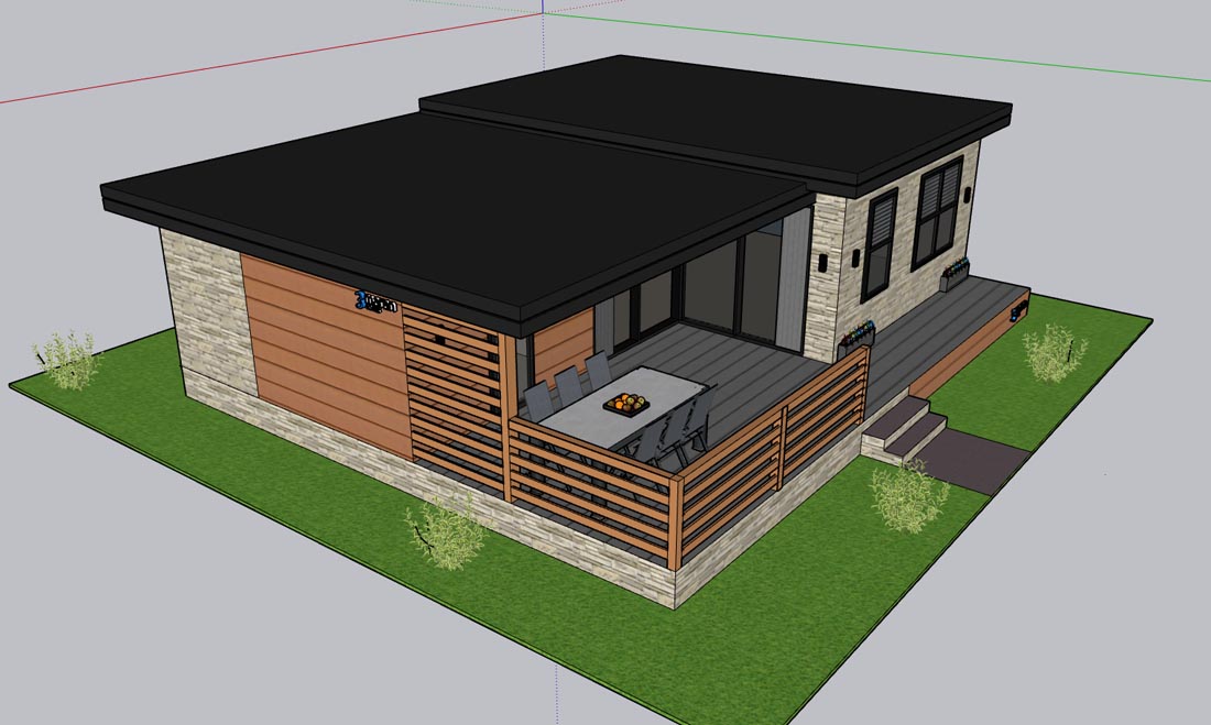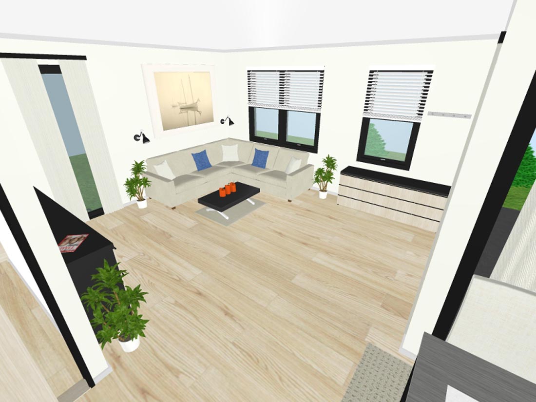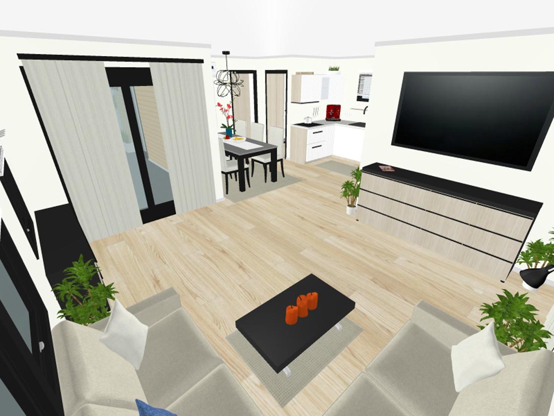 Dnevna soba je opremljena s sedežno garnituro, ki jo lahko raztegnete v ležišče za 2 osebi (140 x 200 cm), mizico in nizko omaro.