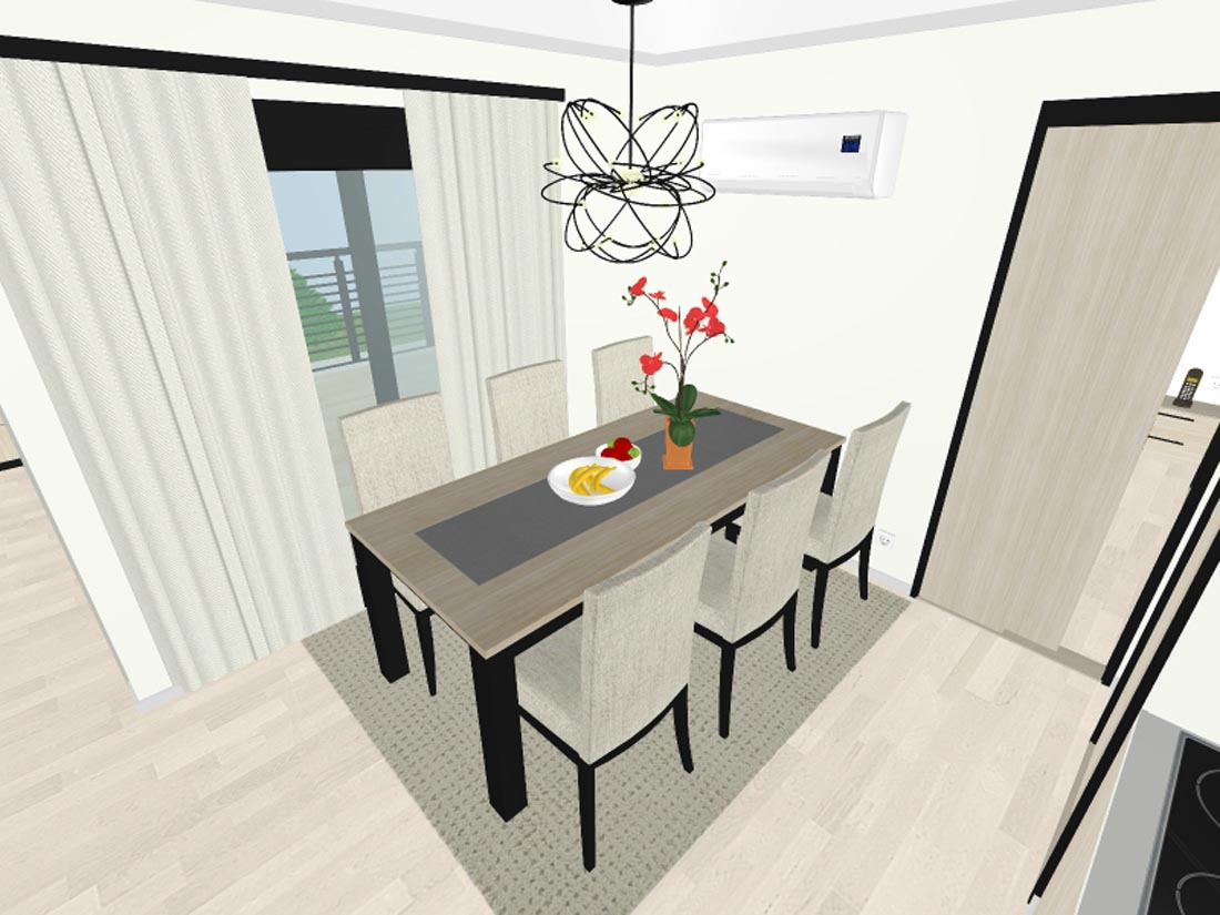 Jedilnica ima moderno mizo in 6 oblazinjenih stolov.