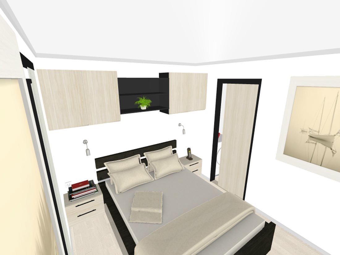 Spalnica 1 je opremljena z zakonsko posteljo (160 x 200 cm) in omarami s stenskim mostom.